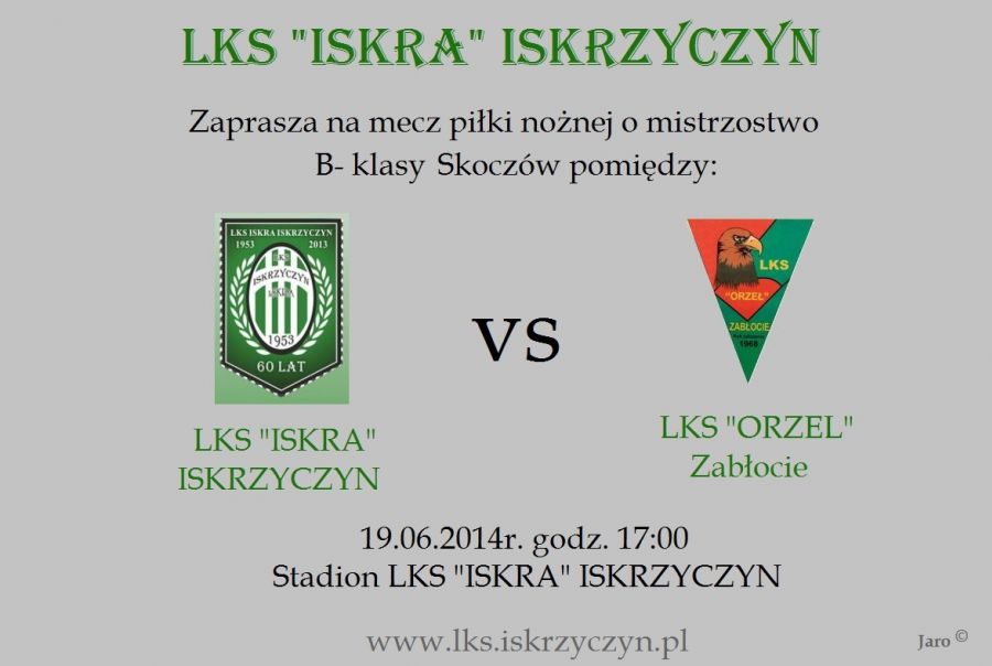 Dnia 19 czerwca w ostatniej XXII kolejce spotkań B- klasy Skoczów nasza Seniorska drużyna będzie podejmować na swoim boisku drużyne "ORŁA" Zabłocie. Mecz rozpocznie się o godz. 17:00.